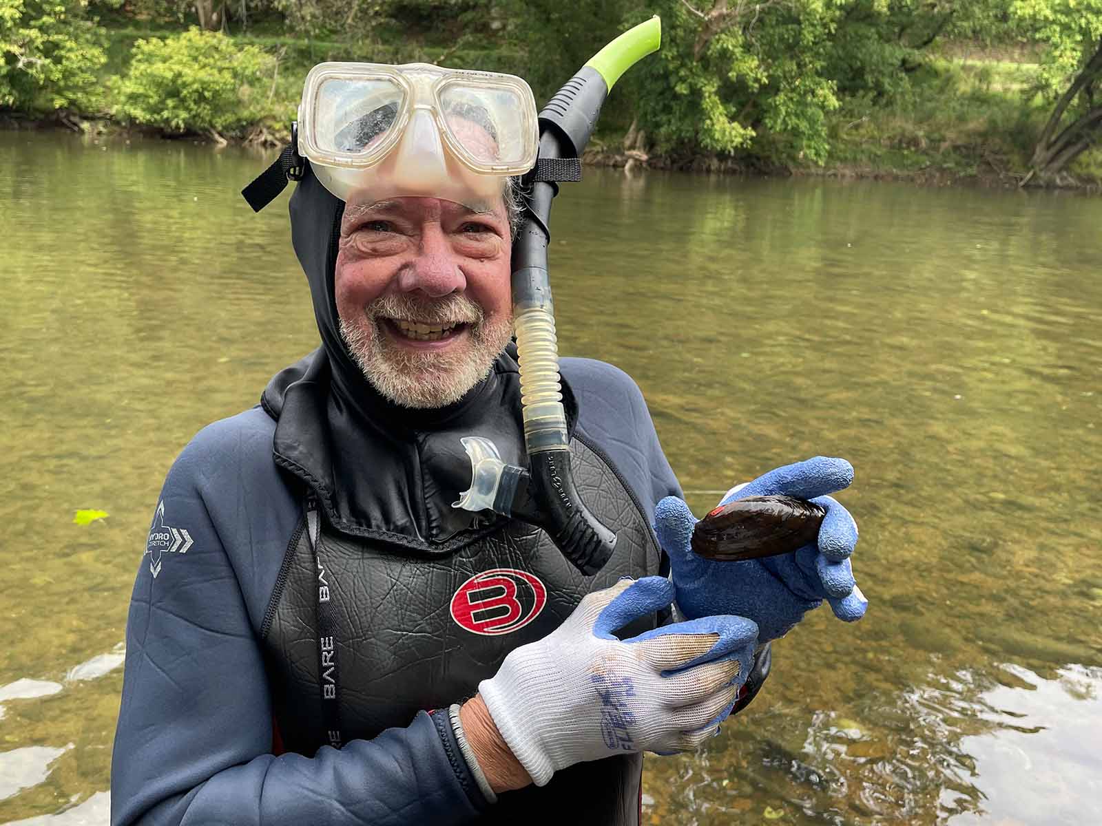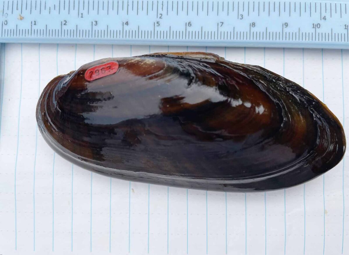 Pang-adultong Black Sandshell. Ang Mussel Propagation Specialist na si Joe Ferraro ay may hawak na isang pang-adultong Black Sandshell na ginawa ng AWCC noong 2013.