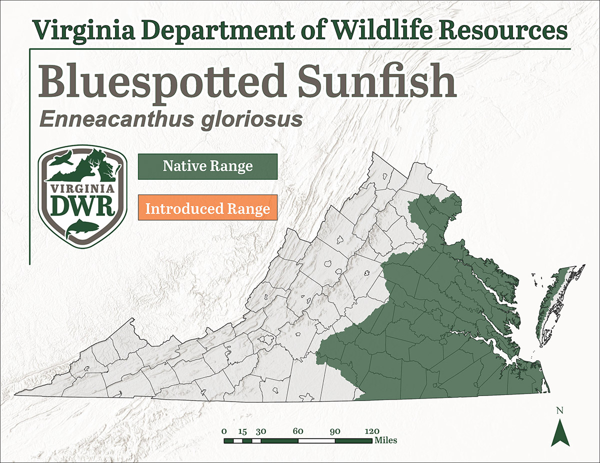 Ang Bluespotted Sunfish ay katutubong sa karamihan ng freshwaters ng Virginia sa silangan ng Blue Ridge.