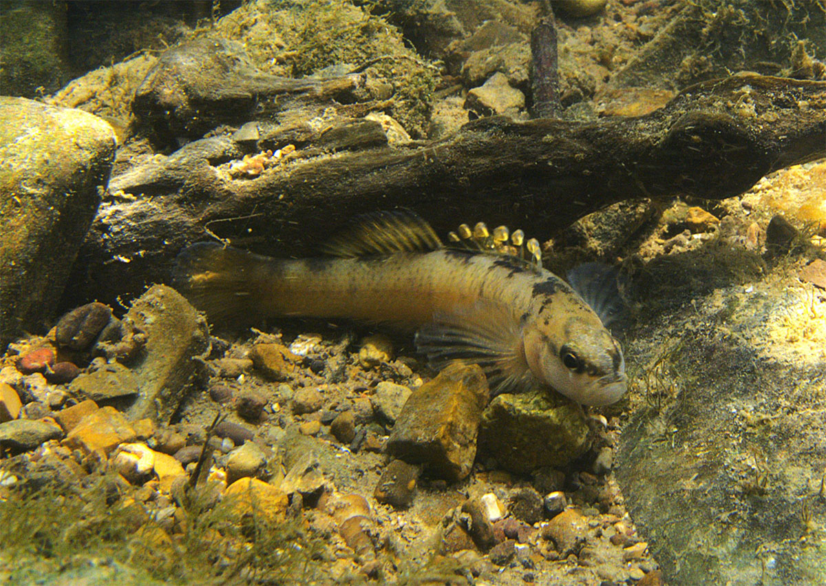 Isang lalaking Duskytail Darter sa gitna ng stream cobble. Larawan ni © Mike Pinder - DWR
