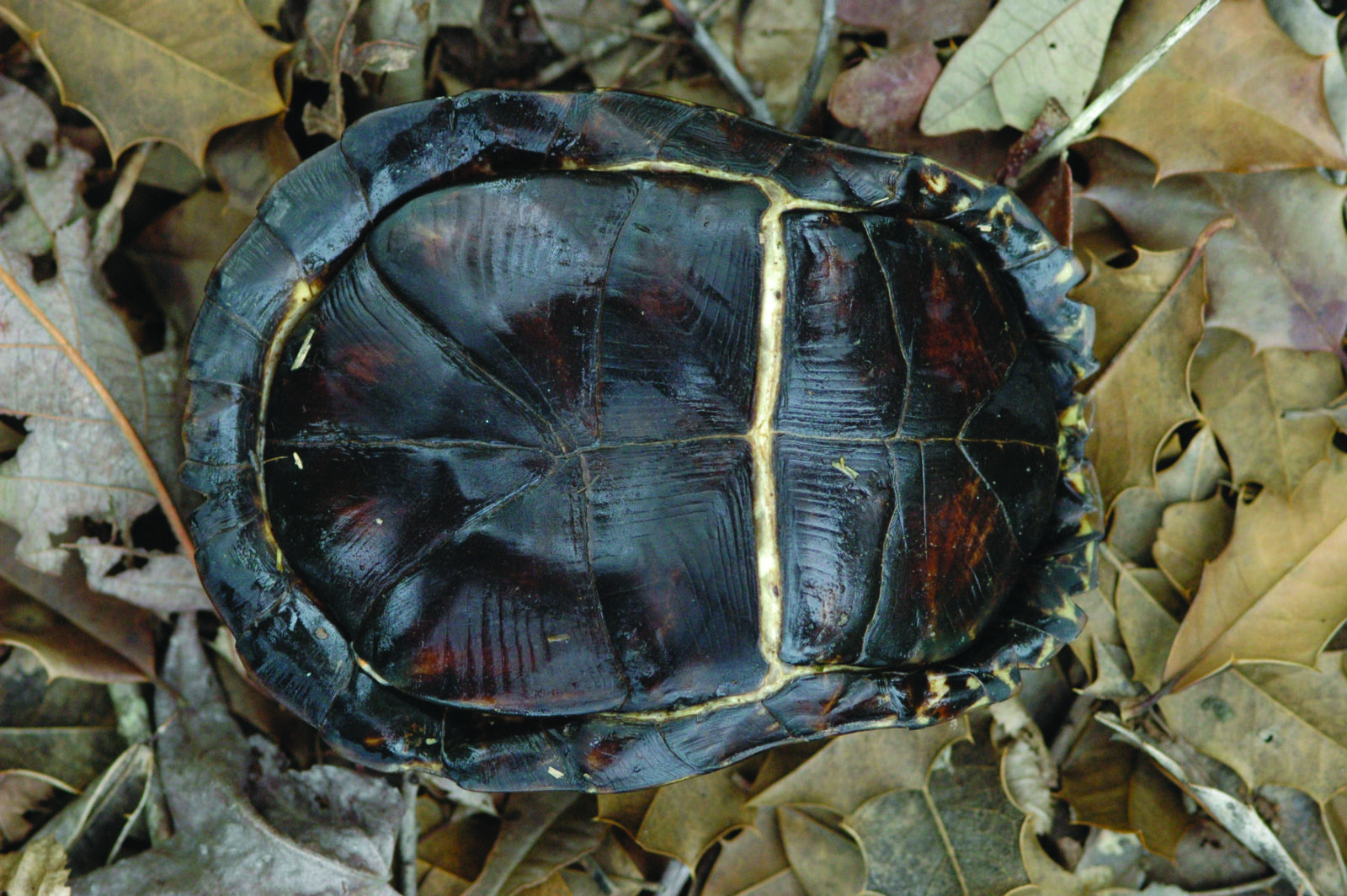 Isang imahe ng isang male box turtle; mayroon silang mga pulang mata at isang malukong plastron (c) JD Kleopfer