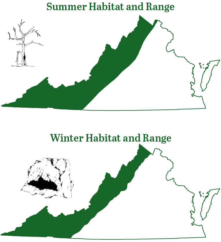 Siyamnapu't limang porsyento ng kilalang populasyon ng mga paniki na ito ay nag-hibernate sa 15 mga kuweba lamang. Sa Virginia, ang Indiana bat ay matatagpuan sa mababang bilang sa labindalawang iba't ibang kuweba. Bumababa ang populasyon ng Indiana bat ng Commonwealth mula noong una silang na-survey noong 1970s.
