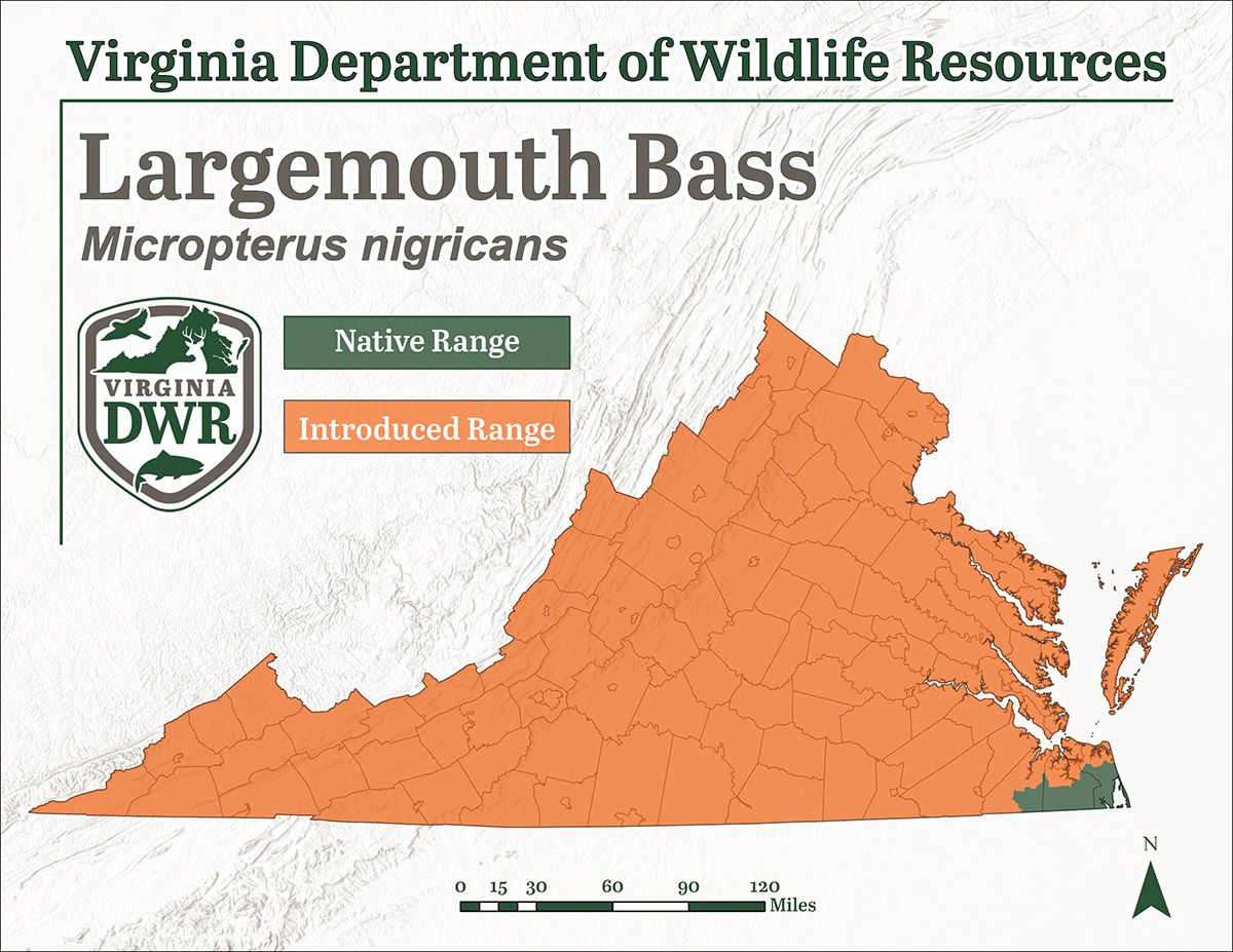 Ang Largemouth Bass ay isa sa pinakasikat na sportfish sa United States, at matatagpuan sa buong Virginia. Ang mga ito ay katutubong sa isang maliit na bahagi ng Albermarle basin sa timog-silangang Virginia.