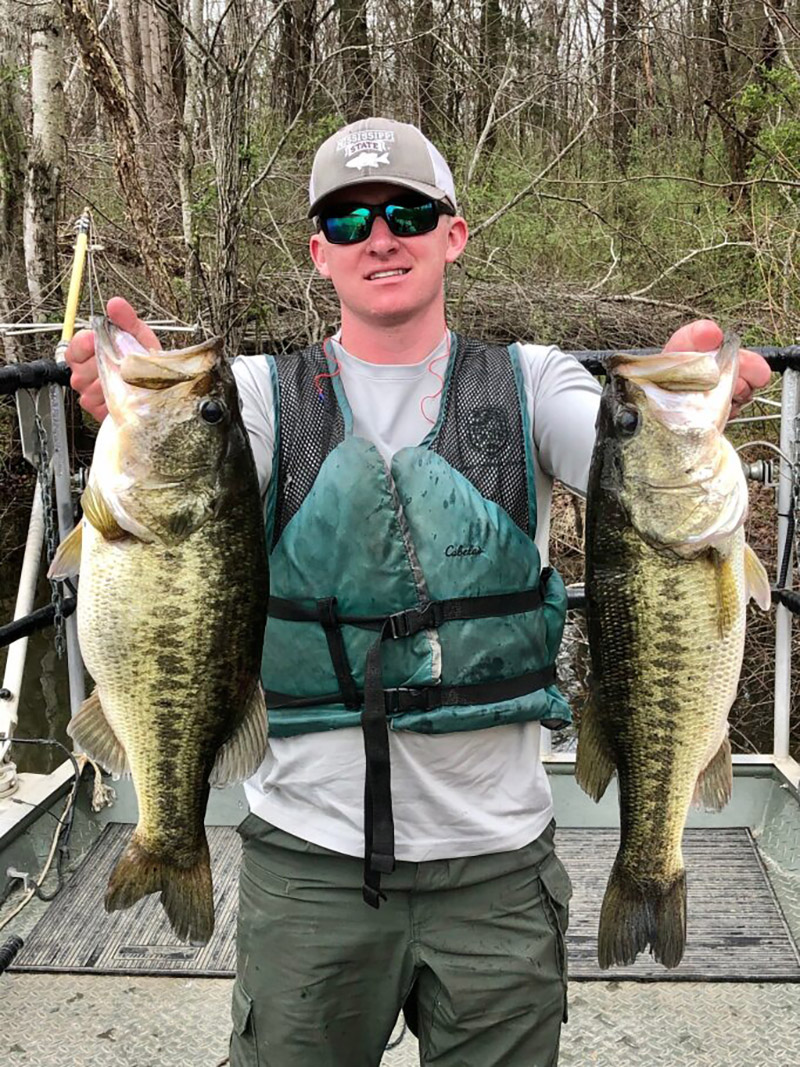Ang Rehiyon II Fisheries Biologist Hunter Hatcher ay nagpapakita ng dalawang Largemouth Bass na nakolekta sa panahon ng isang survey sa komunidad ng isda.