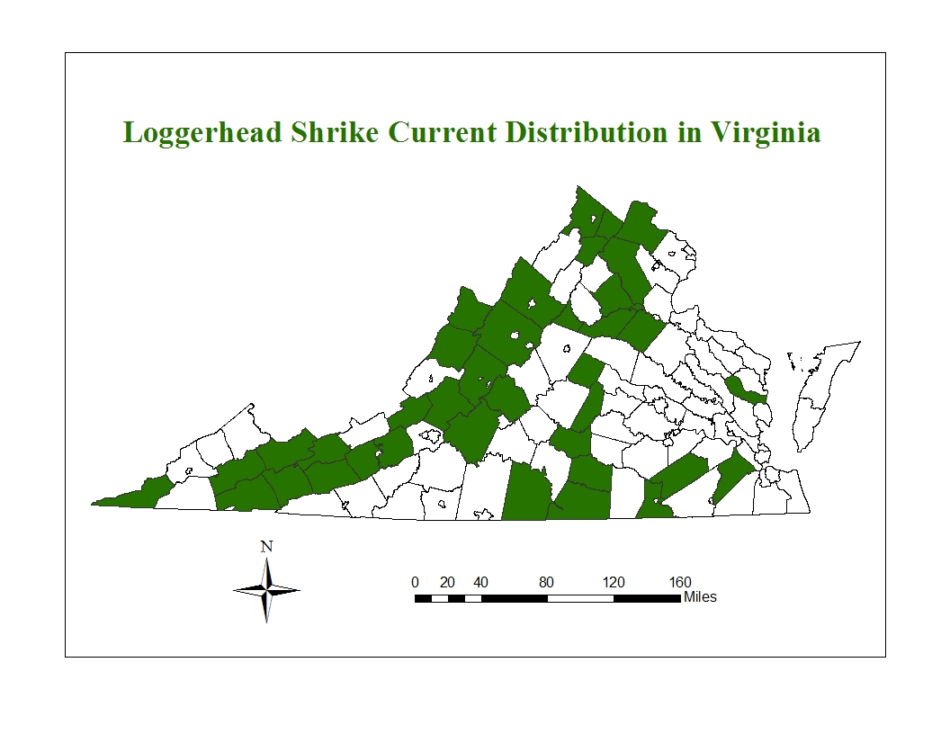 Karamihan sa ating nalalaman tungkol sa pangunahing pag-aanak at taglamig na ekolohiya ng mga shrike sa Virginia ay ang resulta ng pagpopondo ng Department of Wildlife Resources (DWR) ng dalawang pag-aaral ng Virginia Tech noong 1980s. Ang mga proyektong iyon ay nakatuon sa Shenandoah Valley sa mga county ng Augusta, Rockingham at Shenandoah. Pinondohan ng DWR ang mga follow-up na survey sa pamamagitan ng Virginia Tech sa 1996 at 1997: ng halos 50 na mga site kung saan naidokumento ang pag-aanak noong 1980s, isang site pa rin ang inookupahan. Sinasaklaw ng mga survey 51 na mga county sa mga rehiyon ng Coastal Plain, Piedmont at Mountains and Valleys, na nagdodokumento ng mga shrik sa 12 ng mga county na iyon.