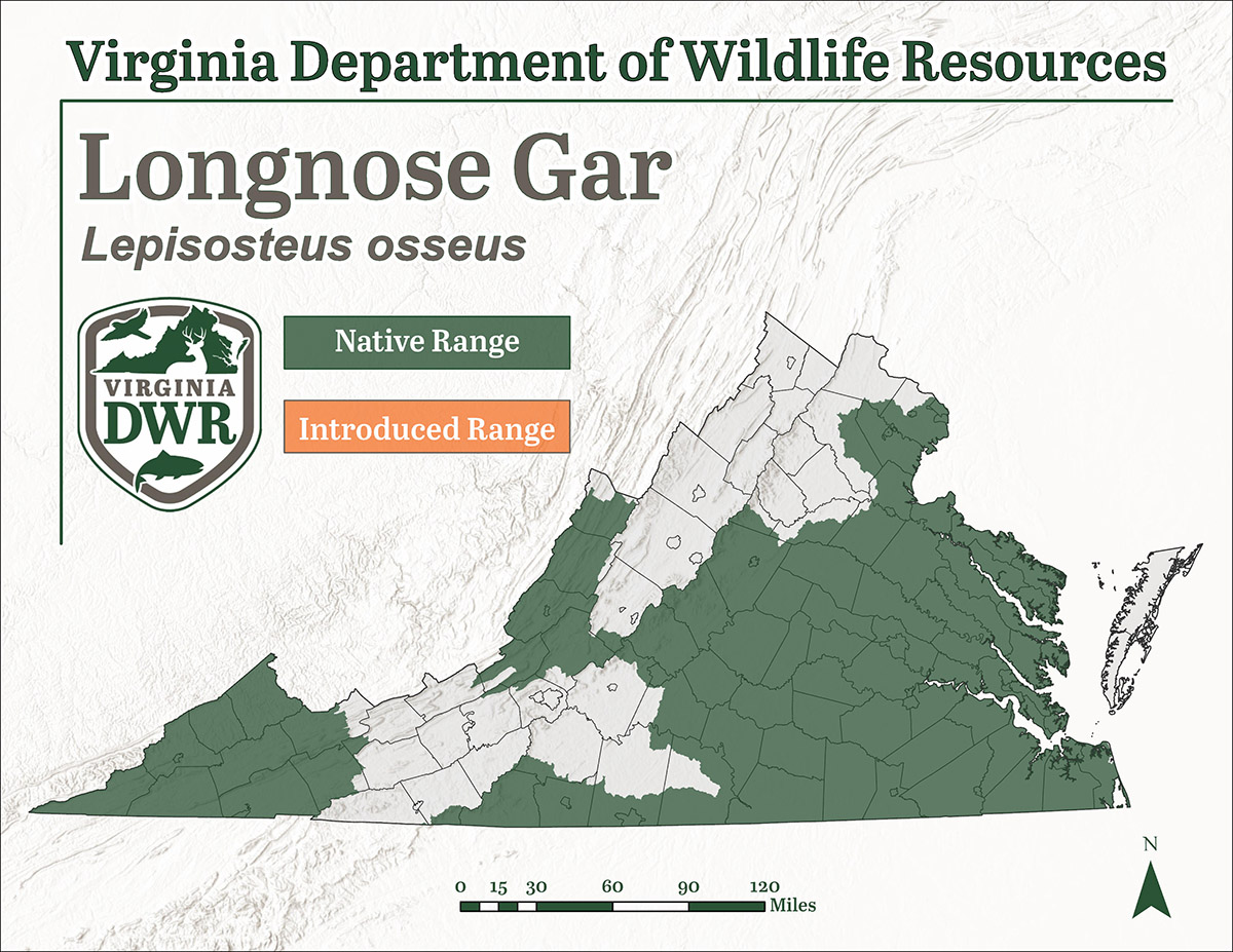 Ang Longnose Gar ay katutubong sa Virginia, at makikita sa buong James, Potomac, Rappahannock, Roanoke, Upper Cumberland, Upper Tennessee, at York watershed.