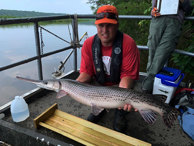 Ang Virginia Master Angler na si Derek Merricks ay nakakuha ng mabilisang larawan na may trophy na Longnose Gar bago ito ilabas.