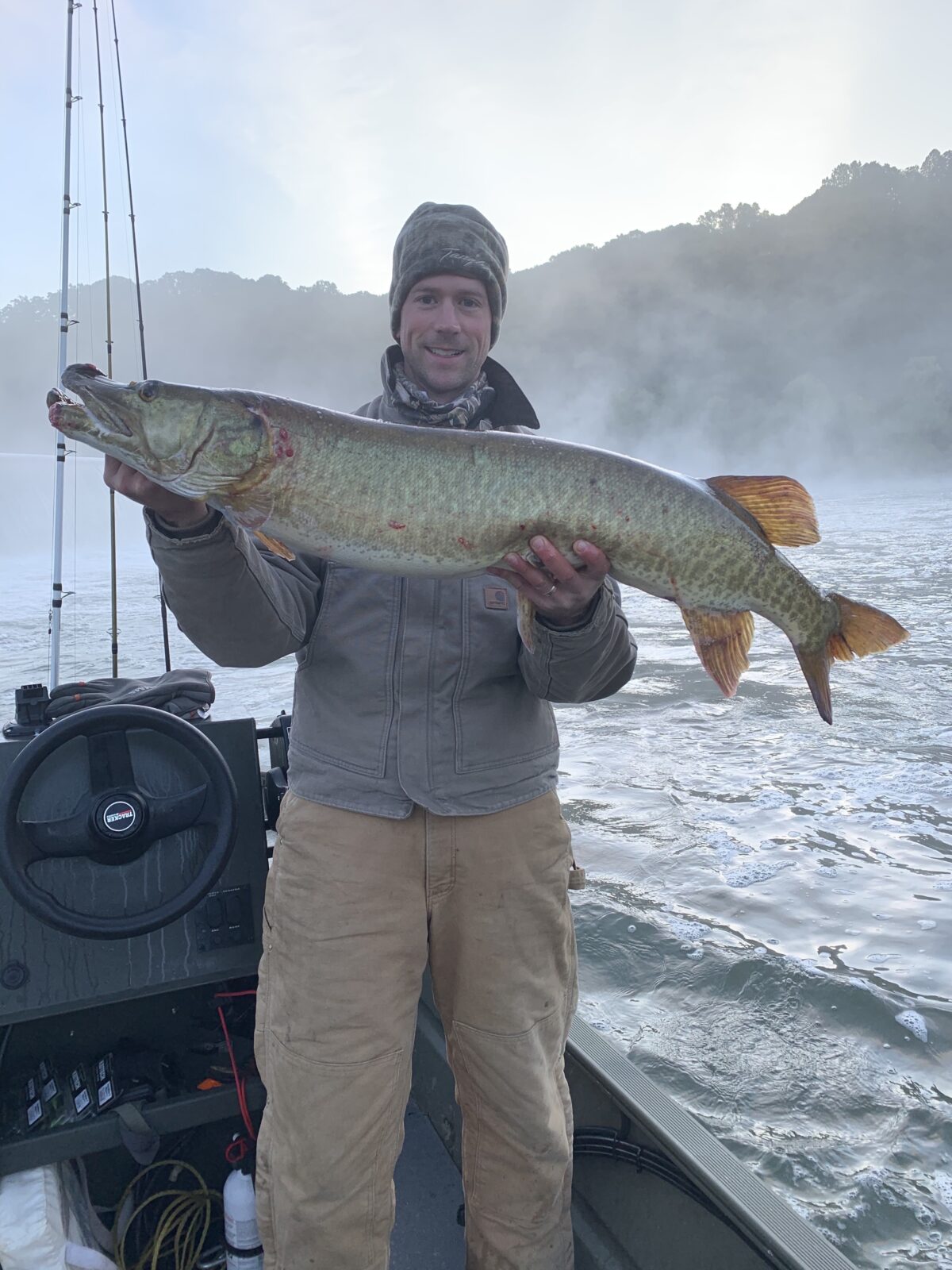 Ang Fisheries Biologist na si Tyler Young na may isang malaking Musky na nahuli habang nangingisda. ©Larawan ni Meghan Marchetti - DWR