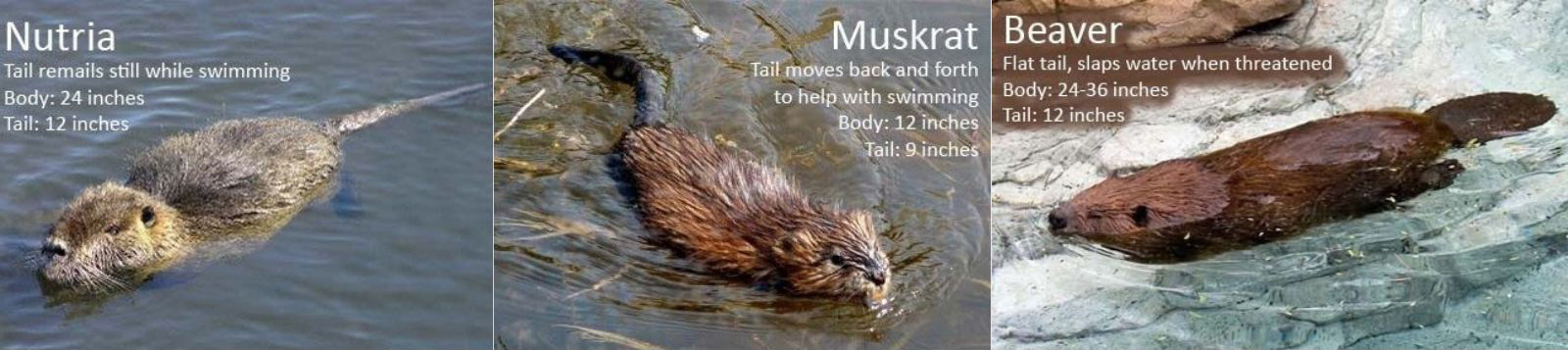 Ang nutria ay madaling malito sa muskrat o beaver. Ang Nutria ay mas malaki kaysa sa mga muskrat ngunit mas maliit kaysa sa mga beaver, at may likod na lumilitaw na mas arko. Kapansin-pansin, ang nutria ay may isang mabalahibo, bilog na buntot at kitang-kita, puting bigote. Habang lumalangoy, ang nutria ay panatilihing tuwid ang kanilang mga buntot, na nag-drag sa likod nila, habang ang isang muskrat ay gumagalaw ng kanilang mga buntot sa isang ahas na paraan kapag lumalangoy.