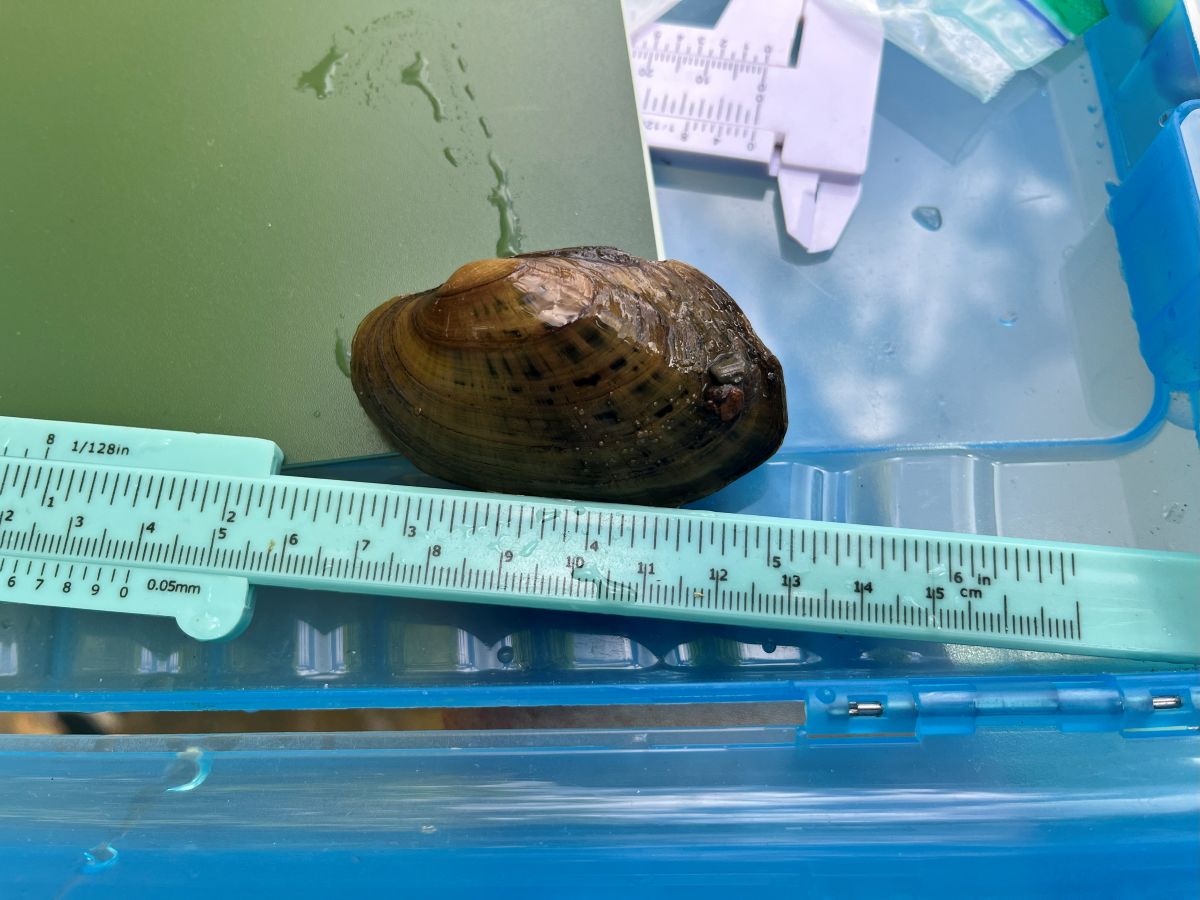 Isang Pheasantshell na sinusukat sa panahon ng taunang survey ng Musselrama. Larawan ni ©Kayla Howard - DWR