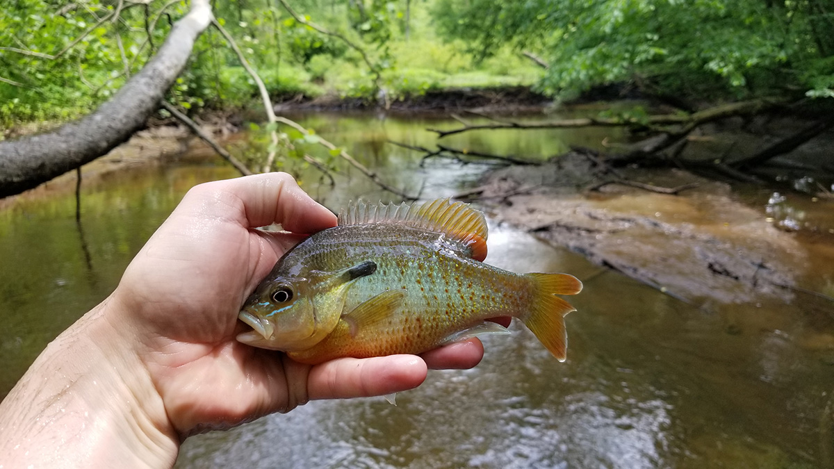 Isang mamimingwit ang nagpapakita ng isang Redbreast Sunfish na nahuli sa isang batis sa baybayin.