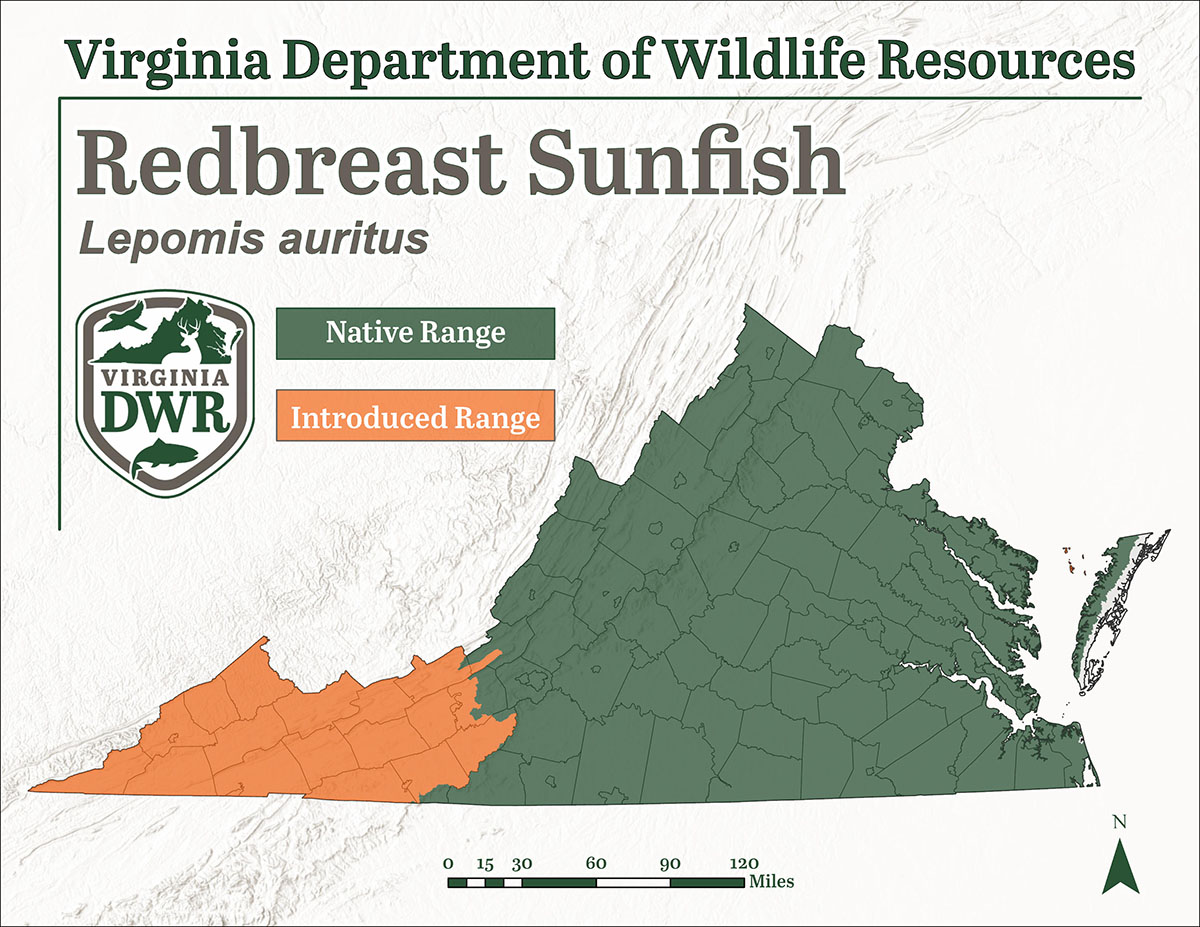 Ang Redbreast Sunfish ay katutubong sa isang malaking bahagi ng Virginia, maliban sa timog-kanlurang Virginia kung saan sila ay ipinakilala at nagpapanatili ng mga naitatag na populasyon.