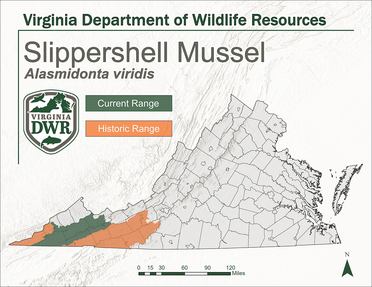 Ang Slippershell Mussel ay nakaranas ng matinding pagbaba sa buong Virginia, na may ilang maliit na populasyon na lamang ang natitira. Ang Aquatic Wildlife Conservation Center (AWCC) ng DWR ay kasalukuyang nagtatrabaho upang maibalik ang species na ito sa buong upper Tennessee River basin sa timog-kanlurang Virginia.