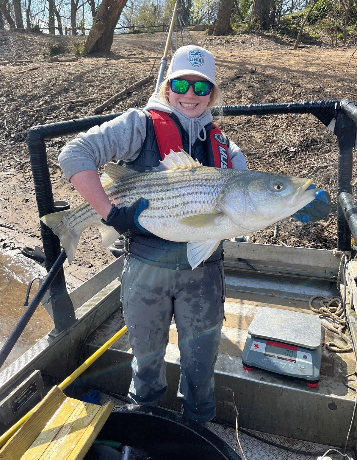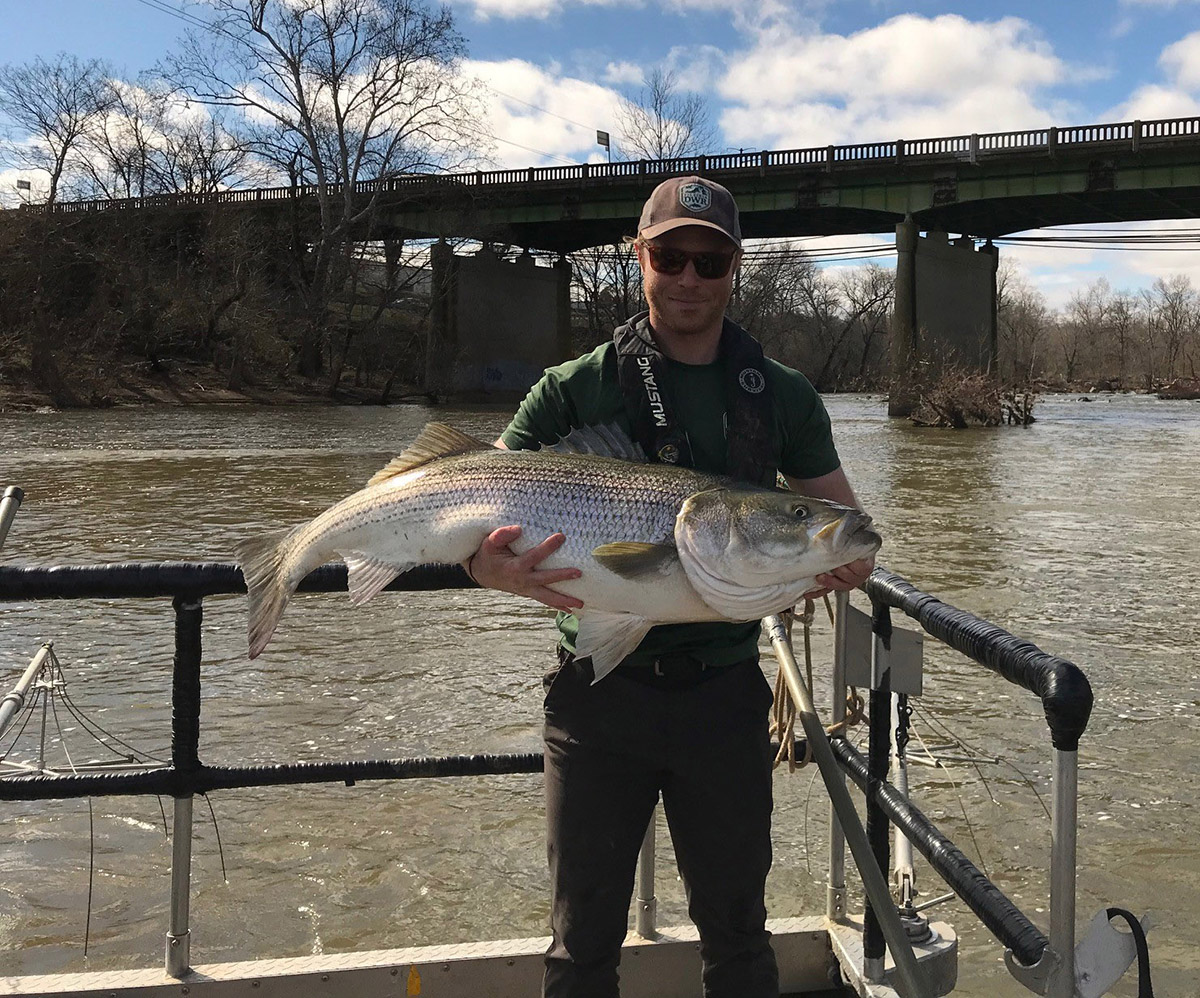 Ang DWR Fish Passage Biologist ay nagsasagawa ng pagsubaybay sa pagiging epektibo sa mga lugar ng proyekto sa buong Virginia. Nasa larawan ang Assistant Fish Passage Biologist na si Matthias Gaffney na may hawak na malaking migratory Striped Bass. © Larawan ni Alan Weaver