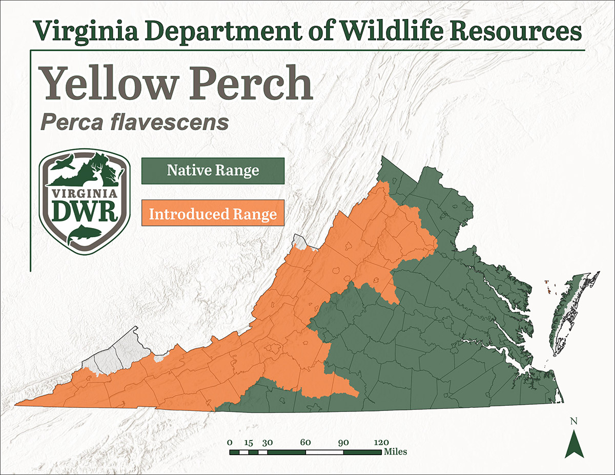 Ang katutubong hanay ng Yellow Perch sa Virginia ay umaabot mula sa malalaking tidal coastal plain tributaries, hanggang sa mga freestone na bahagi ng mga ilog na ito sa piedmont. Ipinakilala ang mga ito sa halos buong estado dahil sa kanilang halaga bilang isang mapagkukunang panlibangan.